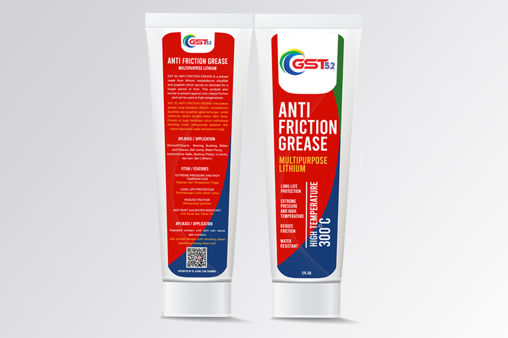GST 52 ANTI FRICTION GREASE merupakan grease yang berbahan lithium, molybdenum disulfida dan graphite yang berfungsi untuk melumasi dalam jangka waktu lebih lama. Produk ini juga berfungsi untuk melindungi terhadap karat, mengurangi gesekan dan dapat digunakan pada temperatur tinggi.